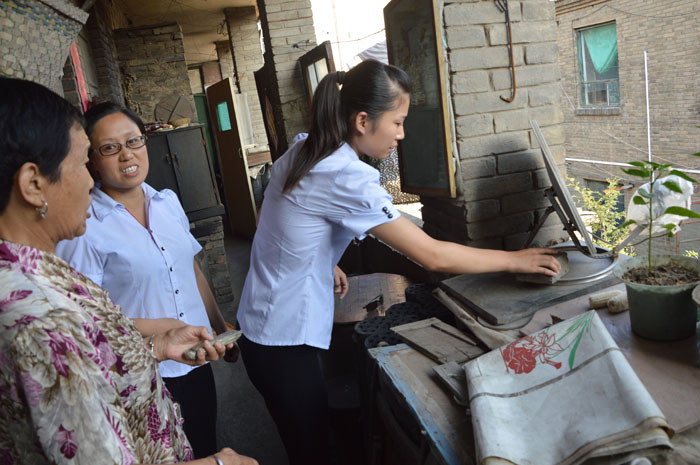 工作人员给老人讲解卫星接收器的使用注意事项