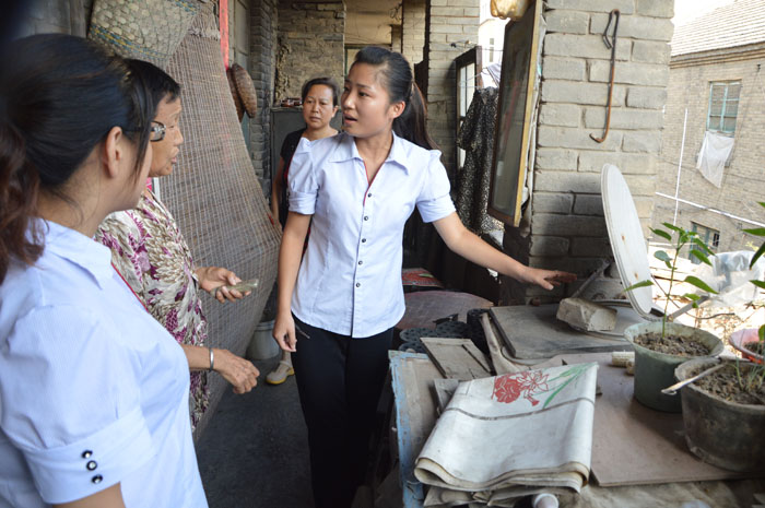工作人员认真帮助老人修理卫星接收器