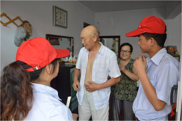 图为中心全体员工上门探望卫大爷。2013年12月23日上午,中心工作人员上门探望家住晓庄社区的卫大爷。卫大爷看到我们前来,心情非常激动,热心向我们讲述他生活中的点点滴滴,工作人员耐心听老人的倾诉,根据老人的情况,进行了沟通、开导和安慰,在一片欢笑声中,我们结束了此次探望。