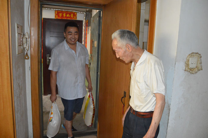 图为中心工作人员上门帮宋大爷送面。2014年7月3日,中心工作人员接到家住黄花街社区华西小区的宋大爷的求助,称其需要2袋面粉和1袋大米,中心工作人员详细了解老人需求后,迅速派出为老服务人员,上门为老人送面,并帮老人把面放到老人家里,老人看着我们服务人员汗流浃背的样子,说“你们辛苦了”,服务人员说“没事,为老人服务是我们的义务”。