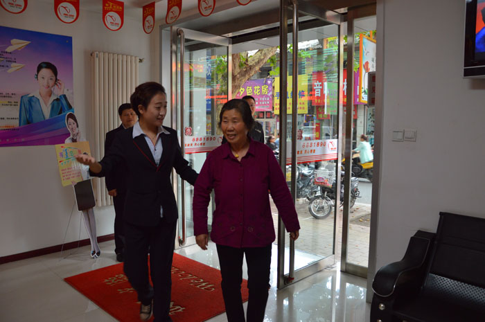 老人在中心工作人员的搀扶下走进服务大厅