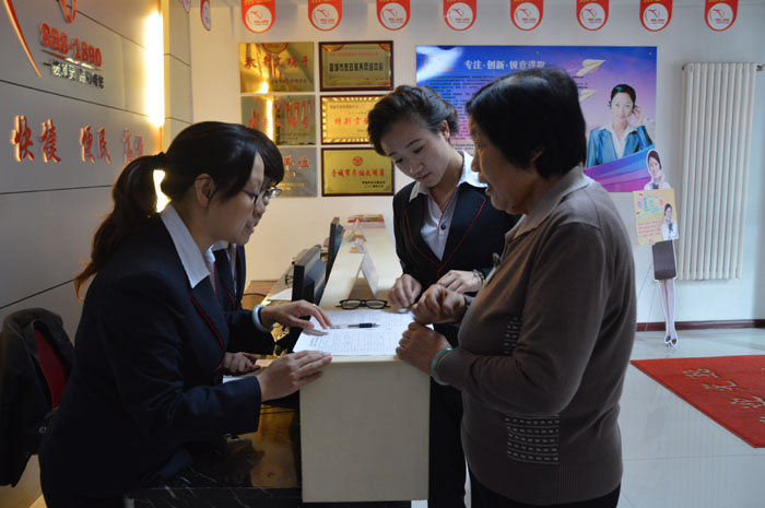 老人在中心工作人员的协助下认真填写登记表